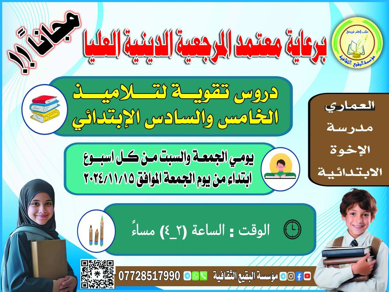 تقيم مؤسسة البقيع الثقافية دروس تقوية لطلبة الخامس والسادس الأبتدائي. يومي الجمعة والسبت من كل أسبوع. ابتداء من يوم الجمعة الموافق ١٥ - ١١ - ٢٠٢٤.